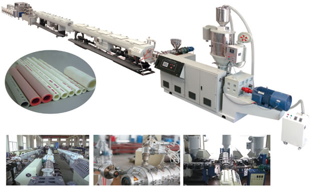 PPR pipe production line is consist of SJ series extruder,mold,vacuum tank,spraying cooling tank,haul-off,no-dust cutting machine,stacker.It is apply to produce PPR,PE-RT cold and hot water supply pipe.Equipped other extruder,different mold,it could produce PPR double-layer pipe,muti-layer pipe,PPR fiberglass reinforce pipe.